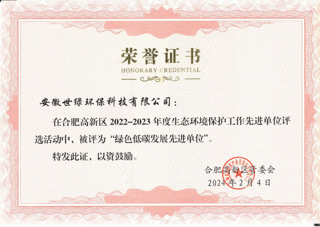 近日,在合肥高新區2022-2023年度生態環境保護工作先進單位評選活動中,我公司被評為“綠色低碳發展先進單位”。